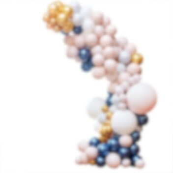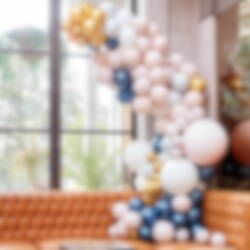 Ylellinen DIY-ilmapallokaari väreissä sininen, kulta, puuterimaisen vaaleanpunainen ja valkoinen. Tee juhlista hieman ekslusiivisempi tämän paketin avulla.