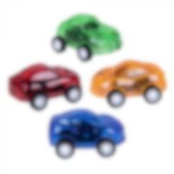 4 kpl iloisen värisiä leluautoa. Hauska lisä juhlapussiin tai pinataan juhlissa. Lelut ovat noin 4 cm korkeita ja ne on valmistettu muovista.