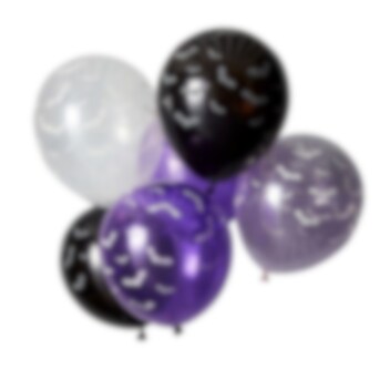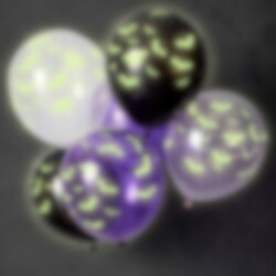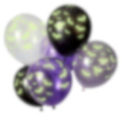 6 kpl cooleja ilmapalloja mustana, läpinäkyvänä ja violettina, kuvat pimeässä hohtavista lepakoista kokoelmalta Let's Get Batty. Mahtava lisä Halloween-juhlien tilan koristeluun. Pallot ovat n. 30 cm halkaisijaltaan puhallettuina, ja täytetään heliumilla tai tavallisella ilmalla.