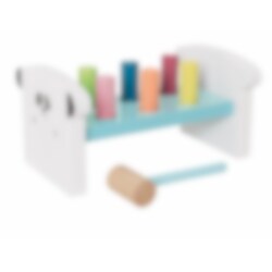 Jabadabadon klassinen puinen hakkalelu hienoissa väreissä pandateemalla. Hauska kastelahja, joka auttaa lastasi harjoittelemaan koordinaatiota. Lyö tappeja mukaan kuuluvalla vasaralla. Kun kaikki tapit on hakattu paikoilleen, tarvitsee vain kääntää hakkalelu ylösalaisin ja aloittaa uudelleen. Hakkalelun mitat ovat noin 22 x 13 x 11 cm.