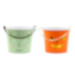 2 kpl. karkkiämpäreitä erilaisilla hauskoilla Halloween-kuvilla. Täydellinen "karkki tai kepponen" -kävelylle. Ne on valmistettu pahvista ja niiden koko on 13,5 x 13 cm. Nauha tulee mukana.