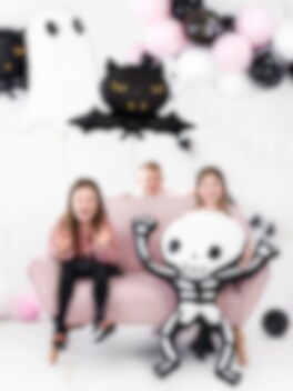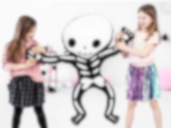 Valkomustaa tanssivaa luurankoa esittävä folioilmapallo. Hauska koriste täytettäväksi synttäreille tai halloweenjuhliin. Ilmapallon mitat ovat noin 84 x 100 cm täytettynä ja se voidaan täyttää ilmalla tai heliumilla.