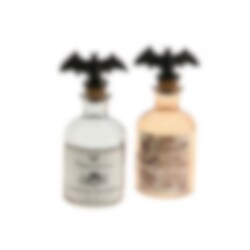 Tyylikäs lasipullo, jossa on lepakko korkissa. Täydellinen koriste Halloweeniin. Täytä se pelottavalla juomalla ja laita tarjolle viimeistellen kammottavan tunnelman.