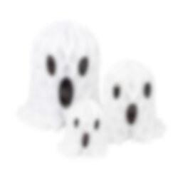 3 pientä hunajakennon muotoista haamua, jotka toimivat upeina koristeina, kun sinulla on halloween-juhlat. Kummituksilla on kolmea eri korkeutta: 32 cm, 23 cm ja 15 cm. Ne sopivat pöydän koristeiksi.