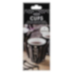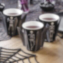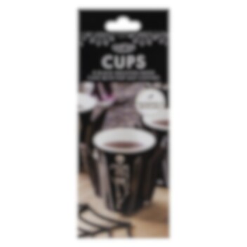 8 mustaa pahvimukia, joissa on hieno kuva 3D-arkussa makaavasta luurangosta. Mukit ovat 10 cm korkeita, ja niihin mahtuu 250 ml.