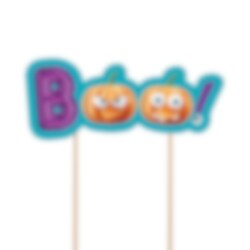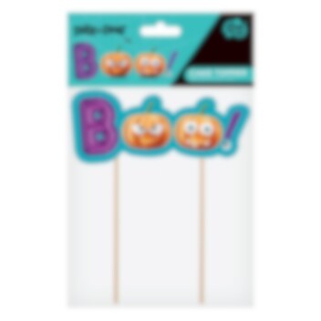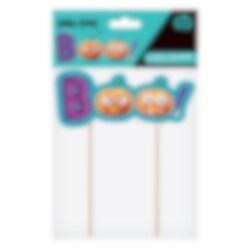 Hieno kakkukoriste, jossa on teksti ''BOO''. Sopii mainiosti leivonnaisten koristeluun Halloweenia varten. Kakkukoriste on valmistettu pahvista ja se on kahden puusta tehdyn tikun päässä. Koko noin 15 x 18 cm.