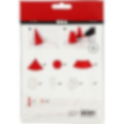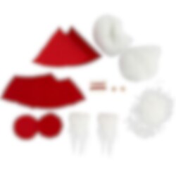 Sisältää: leikattua punaista veluuria, parta, puuhelmiä, polyesteritäyte, muovipalloja ja lankaa. Ohjeet sisältyvät. Koko ilmoittaa valmiin tuotteen mitat.