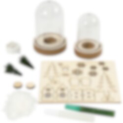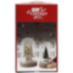 DIY-askartelusetti, kahden upean erikokoisen koristekuvun luomiseksi. Askartele omia persoonallisia kupuja osaksi vuotuista joulukoristeluasi. Askartelusetti sisältää kaksi eri kokoista muovista kupua irtonaisella puupohjalla, puulevyt, joissa on valmiiksileikattuja muotoja rakentelua varten, tekolunta, 2 tuubia valkoista ja vihreää glitterliimaa, 2 vihreää joulukuusta ja pieni LED-valoketju. Huomaa, että nappiparistot eivät sisälly pakkaukseen. Pakkaus sisältää materiaalien lisäksi ohjeet. Kupujen korkeudet ovat 10 + 12,5 cm.