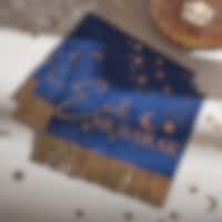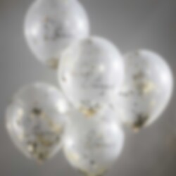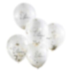 5 kpl. tyylikkäitä ilmapalloja, jotka on täytetty kultaisella konfetilla ja koristeltu tekstillä Eid Mubarak.