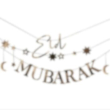 Tyylikäs köynnös kultafoliota jossa on teksti Eid Mubarak sekä 4 kpl tähtiä ja kuuta.