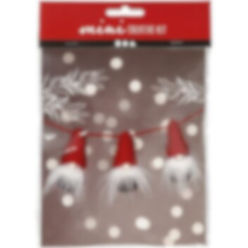 DIY-askartelusetti 3 neulahuovutetulla joulupukin tontulla, joilla on pitkät parrat ja jotka ripustetaan köynnöksiksi juuri sopivasti jouluksi. Tontut ovat noin 6 cm korkeita.