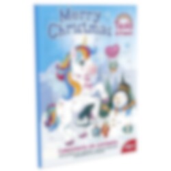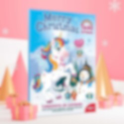 Suklaajoulukalenteri yksisarvisteemalla. Kalenteri on noin 35 x 25 cm.