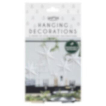 Kukin pakkaus sisältää: 6 paperista valmistettua tähtikoristetta kolmessa eri koossa. 2 x 30 cm, 2 x 22 cm ja 2 x 15 cm.