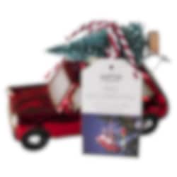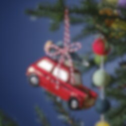 Ihana joulukuusenkoriste, joka on punaisen auton muotoinen, jossa on joulukuusi katolla. Tämä ainutlaatuinen retrotyylinen joulukuusenkoriste tuo leikkisän silauksen joulukuuseen. Se on valmistettu lasista ja on noin 9 × 6 cm kokoinen.