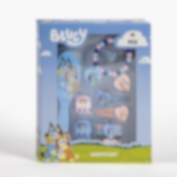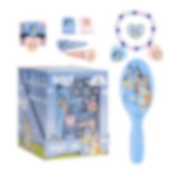 Laittaudu tällä Bluey-setillä, joka sisältää hiusharjan ja koruja! Täydellinen leikkiin, pukeutumiseen tai suloiseksi lahjaksi Bluey-fanille.