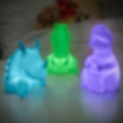 Yhdellä napin painalluksella dinosaurukset alkavat loistaa ja vaihtaa väriä – täydellinen luomaan kodikasta ja rauhoittavaa tunnelmaa nukkumaanmenoaikaan. Paristot sisältyvät hintaan.