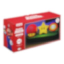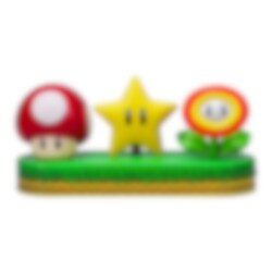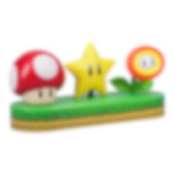 Tämä koristeellinen lamppu on 30 cm leveä ja siinä on kolme klassista Super Mario™ -pelistä tuttua power-up-lisävoimaa – Super Mushroom, Super Star ja Fire Flower – järjestettynä tyylikkäästi alustalle. Sytytä lamppu ja katso näiden legendaaristen ikonien loistavan! Lampussa on myös vaiheittainen valotoiminto, jossa kuvakkeet syttyvät yksi kerrallaan, ja musiikkireaktiivinen tila, joka synkronoi valon äänen kanssa.