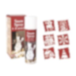 Lumispray ja siihen kuuluvat koristeelliset sapluunat. Koristele ikkunasi näillä talvisen tunnelman luomiseksi. Suihketta ei saa käyttää huonekaluihin. Pullossa on 150 ml ja pakkauksen mukana toimitetaan 8 kpl sapluunoita.