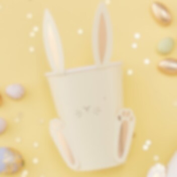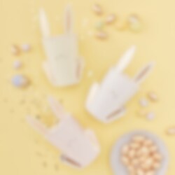 8 kpl. pastellivärisiä pahvimukeja, joissa on pupun kuvioita sekä 3D-korvat ja jalat kultafolioiduilla yksityiskohdilla. Mukit ovat 9 cm korkeita ja niihin mahtuu 270 ml.