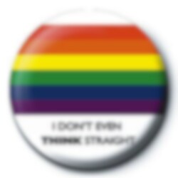 Hieno pieni merkki jossa on Pride-lippukuvio ja teksti "I Don't Even Think Straight". Täydellinen asu Pride-kulkueeseen tai jos vain haluat tukea Pridea. Merkki on halkaisijaltaan noin 2,5 cm, ja se kiinnitetään paikalleen hakaneulalla.