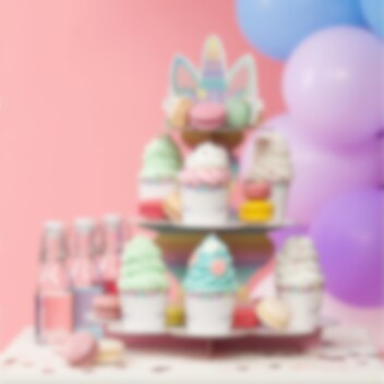 Luo juhlataikaa juhliin tällä yksisarvis-muffinssitelineellä! Kolmella kerroksella ja satumaisella yksisarvisen suunnittelulla siitä tulee ihana lisä jälkiruokapöytään. Täydellinen muffineille, kuppikakuille tai muille herkuille. Teline on 41 cm korkea ja 34 cm leveä, ja se tuo lumoavan silauksen kaikkiin yksisarvisteemaisiin juhliin!