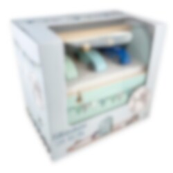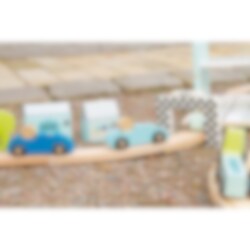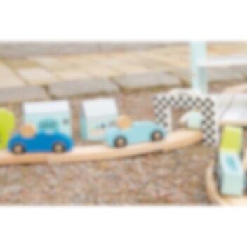 Pakkaus sisältää: 3 x autoja sinisen eri sävyissä 1 x kilpa-automaali 1 x laatikko, jossa on kahva lelujen helppoa kuljetusta varten 12 x tiepalat, joista voit koota kilparadan