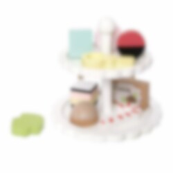 Kaksikerroksinen karkkivati ja 9 kpl mukaankuuluvia karamelleja ihanissa pastelliväreissä Jabadabadolta. Hauska lelu lahjaksi kastejuhliin tai syntymäpäiville. Tarjottimen korkeus on noin 16 cm ja sekä vati että karamellit on valmistettu puusta.