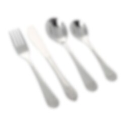 Ruostumattomasta teräksestä valmistetut aterimet, joissa on Nallen, Pomppin, Kilpisen ja Kissa Jansonin kasvot. Todella suloinen kastelahja.