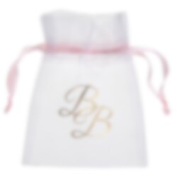 6 kpl vaaleanpunaisia organzapusseja jossa on teksti "BB". Nämä pussit sopivat täydellisesti esimerkiksi ristiäisiin tai vauvajuhliin.