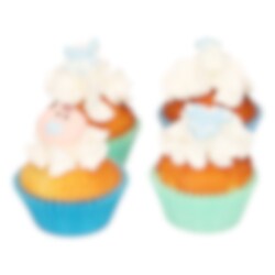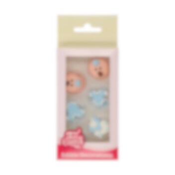 8 kpl sokerikoristeita, jotka esittävät sinisiä vauva-aiheita. Hauskoja kakun tai leivonnaisten koristeluun, kun on vauvakutsujen aika.