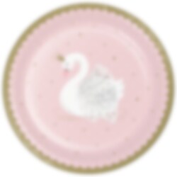 8 kpl pahvilautasia vaikuttavalla joutsenen kuvalla vaaleanpunaisella taustalla ja kultareunuksilla. Hauska tarvike juhlapöydän kattaukseen synttäreille, joiden teemana on Stylish Swan. Lautasten halkaisija on noin 22 cm.