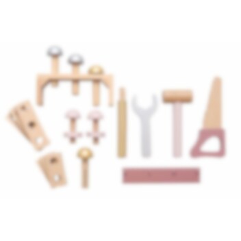 Vaaleanpunainen puinen työkalulaatikko, jossa on mukana työkaluja. Täydellinen lahja lapselle, joka rakastaa rakentamista ja puuhastelua. Tämä lelu tarjoaa stimuloivaa ja luovaa leikkiä, sekä opettaa samalla lapsille värejä ja muotoja. Työkalulaatikon mitat ovat noin 23 x 12 x 16 cm.
