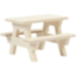 Pieni vanerista valmistettu piknikpöytä, jonka ääressä tonttu voi istua. Pöytä on kooltaan noin 8 x 8 x 5,5 cm.