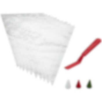 Sisältö: 1 kulmikas lasta (22,8 cm), 3 kpl pursotinkärkiä (2 kpl pyöreä, avoin tähdenmuotoinen) ja 10 kpl pursotinpusseja (30 cm).