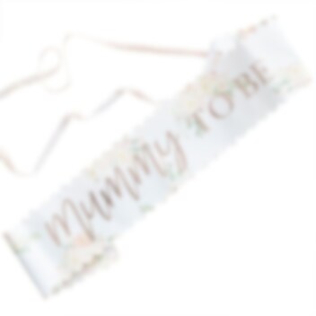 Kaunis kukkakuvioinen olkanauha, jota äiti voi käyttää babyshowereissa. Olkanauha on valkoinen ja teksti on ruusukultainen. Se on noin 75 cm pitkä ja 10 cm leveä.