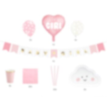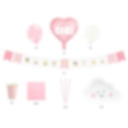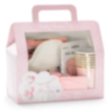 Valmis babyshower-paketti väreissä valkoinen ja pinkki. Täydellinen kun haluat valmistella babyshowereihin mahdollisimman kätevästi.