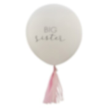 Suuri valkoinen ilmapallo, jossa teksti ''Big Sister'' ja hienoja vaaleanpunaisia tupsuja. Ilmapallo on halkaisijaltaan 45 cm täytettynä ja sen mukana tulee 2 vaaleanpunaista tupsua.