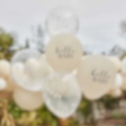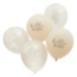 5 ilmapalloa. Kahdessa on "Hello Baby" -teksti ja lopuissa on valkoista pilvenmuotoista konfettia. Sopivat täydellisesti baby shower -kutsuille. Ilmapallot ovat halkaisijaltaan noin 30 cm ja ne voidaan täyttää tavallisella ilmalla tai heliumilla. Huomaa, että ilmapalloissa oleva konfetti vaikuttaa ilmapallojen painoon. Siksi emme voi taata, että konfettia sisältävät ilmapallot nousevat ilmaan, jos ne täytetään heliumilla. Emme myöskään suosittele Ultra hi float -aineen käyttöä näissä ilmapalloissa, sillä sisältö tarttuu toisiinsa sen takia. Lateksipallot ovat biohajoavia ja pakkaus on FSC-sertifioitu.