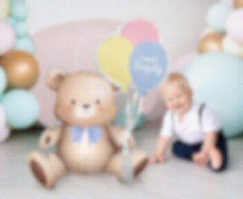 Pehmeää juhlatunnelmaa! Söpö folioilmapallo istuvan nallekarhun muodossa synttäri-ilmapalloilla on täydellinen babyshowereille, kastejuhliin tai suloiseksi koristeeksi lastenhuoneeseen. Pehmeät pastellivärit, kiiltävät yksityiskohdat ja rusetti tekevät nallesta todellisen suosikin isojen ja pienten keskuudessa.
