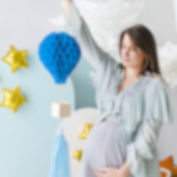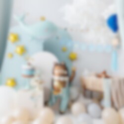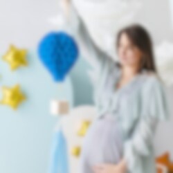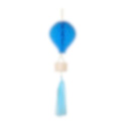 Honeycomb -hunajakennokoriste sinisellä kuumailmapallolla. Koriste on valmistettu paperista ja sen korkeus on 90 cm.