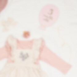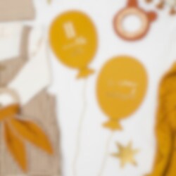 Pakkaus sisältää 12 kpl erivärisiä ilmapallon muotoisia kortteja, joissa on kaksipuolinen painatus. Toisella puolella lukee 1-11 month old &1 week old ja toisella puolella on englanninkielisiä tekstejä. Mukana on myös 3 metriä pitkä kultainen naru.