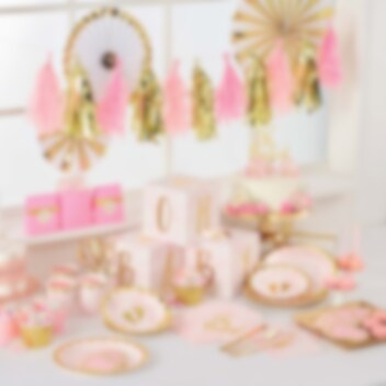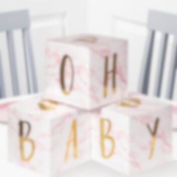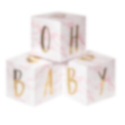 Nämä vaaleanpunaiset "Oh Baby" -pöytäkoristeet ovat täydellinen lisä babyshower-kutsuille. Jokainen pakkaus sisältää kolme kuutiota, jotka voit helposti taitella ja laittaa pöydälle. Kuutiot ovat kauniisti marmoroituja vaaleanpunaisia ja niissä on kirjaimet, jotka muodostavat sanat "Oh Baby", sekä kultafoliolla koristellut pienet vauvan jalat.