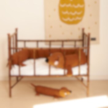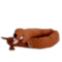 Hurmaava ruosteenpunainen mäyräkoira hienoilla yksityiskohdilla. Koiraa voi käyttää hauskana ja erilaisena suojana pinnasängyssä, suloisena tyynynä tai vanhemmille lapsille halikaverina rentoutumiseen.