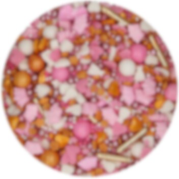 Anna leivonnaisillesi taianomainen silaus tällä lumoavalla strösselillä! Tämä eksklusiivinen sekoitus yhdistää kimaltelevat helmet, suloiset sydämet ja leikkisät 3D-hahmot vaaleanpunaisen, valkoisen ja kultaisen sävyissä. Täydellinen koristamaan kuppikakkuja, kakkuja ja leivoksia prinsessajuhliin tai muihin juhlatilaisuuksiin.