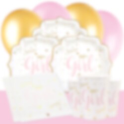 Tämä vauvakutsuille tai ristiäisiin sopiva juhlapaketti sisältää 10 ylellistä lautasta kultaisilla folioreunuksilla (21 x 21 cm cm), 10 söpöä pahvimukia (270 ml) ja 20 kaunista servettiä tekstillä "Girl" (33 x 33 cm) sekä 10 kultaista metallinhohtoista ilmapalloa ja 10 vaaleanpunaista ilmapalloa sekä vaaleanpunaisen muovisen pöytäliinan (137 x 274 cm).
