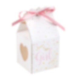 6 kpl pieniä valkoisia lahjarasioita jossa on teksti "Baby Girl" ja hienoja vaaleanpunaisia ja kullanvärisiä yksityiskohtia.