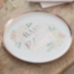 8 valkoista pahvilautasta, joissa on ruusukullan väriset reunat ja teksti "Baby in Bloom" kauniiden kukkien ympäröimänä. Täydellinen lisä Baby in Bloom -teemaisille babyshowereille. Lautaset ovat halkaisijaltaan noin 24 cm.