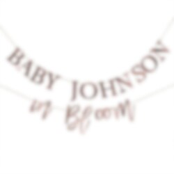 Kaunis Baby in Bloom -malliston ruusukullan värinen DIY-koriste, johon voit lisätä oman persoonallisen kosketuksen Babyshower-juhliin. Vaikuttava koriste, joka vangitsee kaikkien vieraiden katseet. Pakkaus sisältää 2 viiriä joissa on tekstit "Baby" ja "in Bloom", kirjaimet A-Z, sekä 2 metriä pitkän narun. Viiri on valmistettu paperista.
