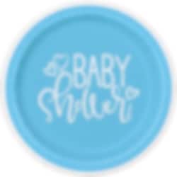 8 kpl sinisiä valkoreunaisia lautasia valkoisella "Baby Shower" tekstillä. Lautaset ovat läpimitaltaan noin 22 cm.