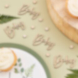 Pakkaus, jossa on puumateriaalista tehtyä konfettia teemassa Botanical Baby. Ripottele pöydälle vauvajuhlien tai kastajaisten aikana. Pakkaus sisältää noin 14 g.